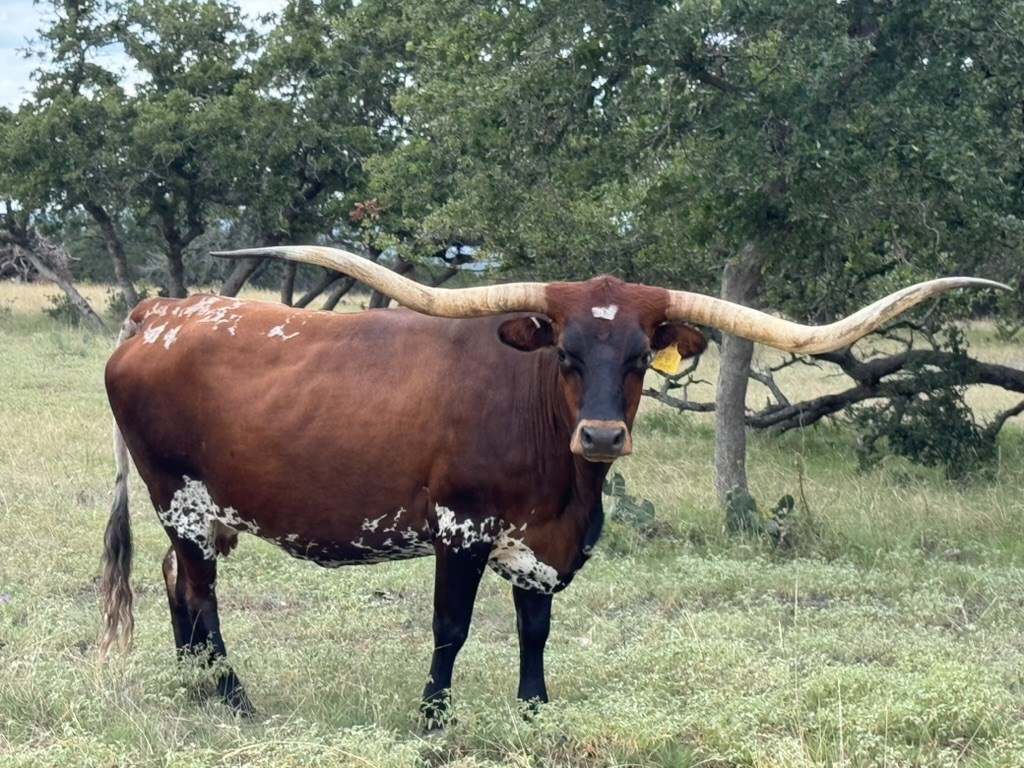a triple twist massive horned cow with beautiful color and a big body. great mama
