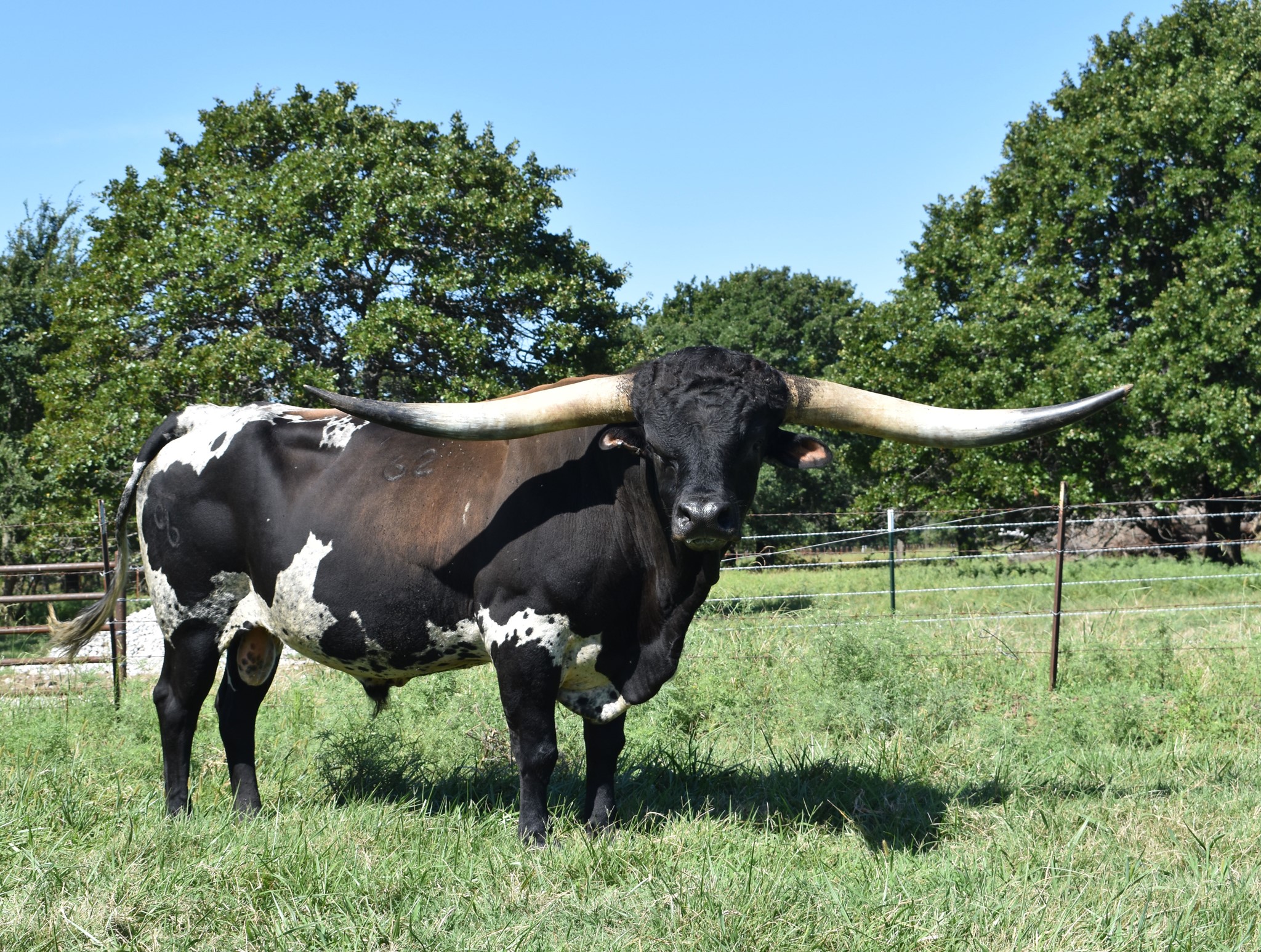DEL CHARRO was a Game Changer! Unfortunately, he died on March 10, 2025 Early horn growth is an important mile marker. Del Charro is in the TOP TEN (#9) in the entire breed for earliest to reach 70" tip to tip. He passed 70" at 649 days. His last measurement put him at 92" tip to tip. He has a proven record of producing Color, Horn & Conformation. We think he is one of the most powerful and colorful sons of World Record horn champ, Cowboy Tuff Chex. We have a few (ONLY a few) straws of semen available $200.00 When these are gone there will not be any more. 605-381-3938